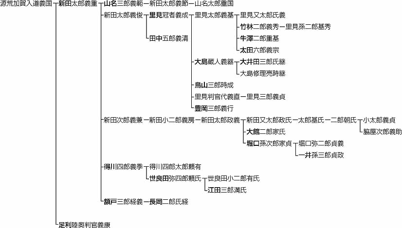 新田氏の始祖義重は、八幡太郎義家の三男義国の長子であり、義重が新田氏、弟の義康が足利氏の祖となった。義重は上野国新田郡を開発し、その所領を摂関家の傍流花山院忠雅に寄進、自身は新田庄の下司職として、この地を実質的に支配した。